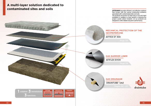 - DRAINTUBE® GAZ is the first layer of this complex dedicated to polluted sites and soils. This draining geocomposite creates a preferential drainage path and prevents any accumulation of gas on the underside of the geomembrane under the building.