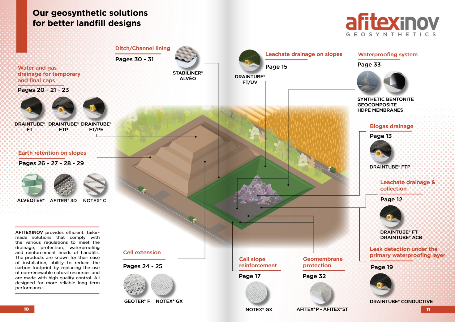 This sales brochure brings together all the geosynthetic solutions for your landfills: embankments, bases, raised sections and cell covers, leak detection under waterproofing, collection in ditches, earth retention on embankments, etc.